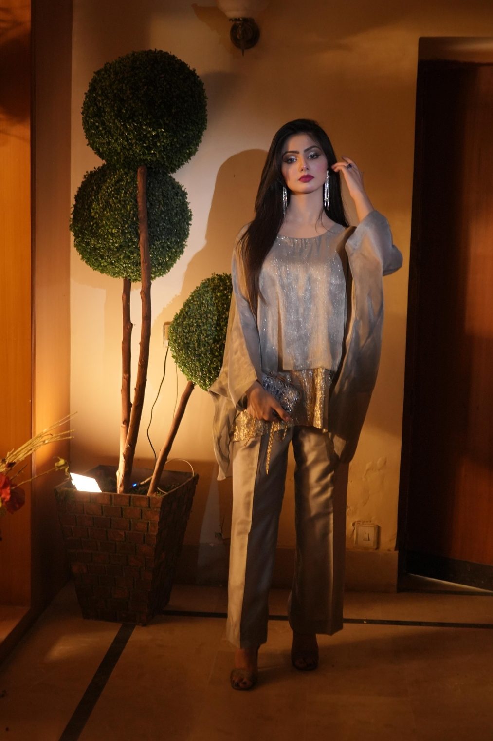 Radiate elegance with Gilded Glow – a shimmery mesori top paired with sleek silver culottes. Perfect for parties, evening events, or festive gatherings, this ensemble is where modern trends meet timeless glamour!