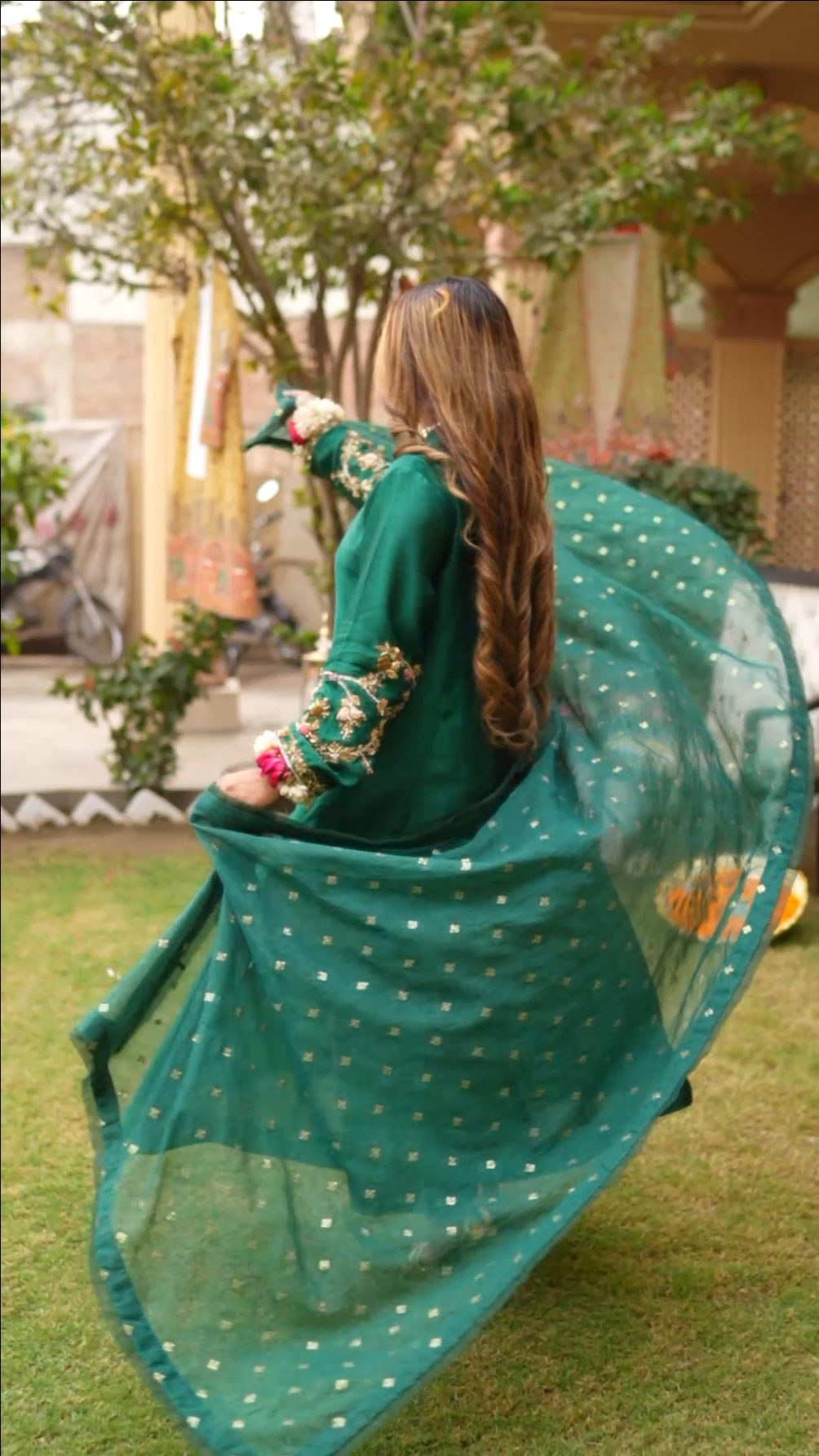 ndulge in opulence with the Saanah Mahar-e-Alam Bottle Green Sheesha Silk Suit, a ready-to-wear masterpiece crafted for Pakistani women who adore luxury. Made from shimmering sheesha silk in a rich bottle green hue, this suit features intricately embroidered sleeves adorned with resham, dapka, and French knot work, adding a touch of traditional artistry. The ensemble is paired with a luxurious khadi net dupatta, embellished with heavy chann and an organza border, creating a regal look perfect for weddings, festive events, or formal gatherings. The flowing silhouette and glossy fabric ensure both comfort and elegance, making this outfit a timeless addition to your wardrobe. Celebrate the essence of Pakistani fashion with Saanah Mahar-e-Alam – where luxury meets tradition!