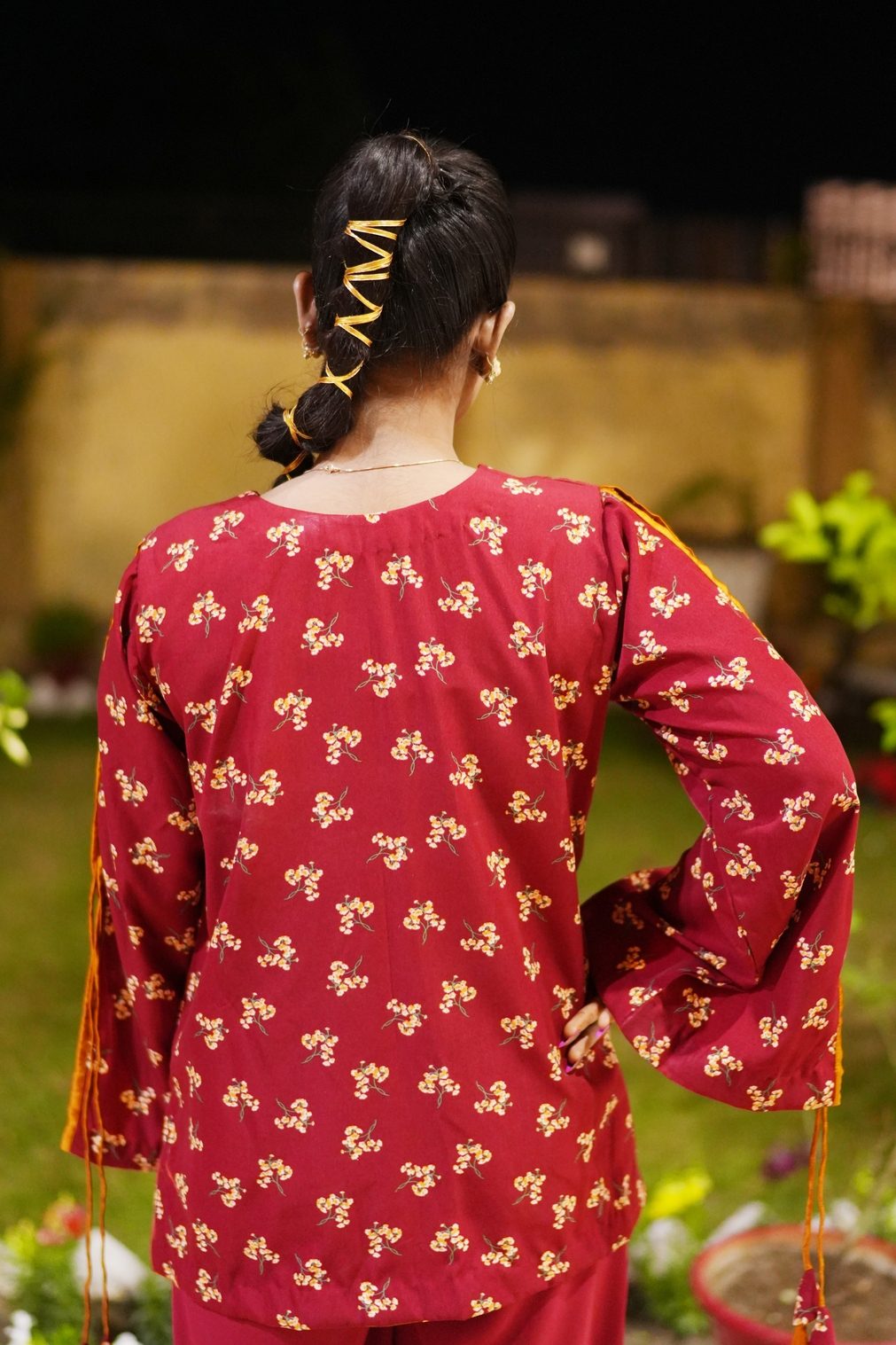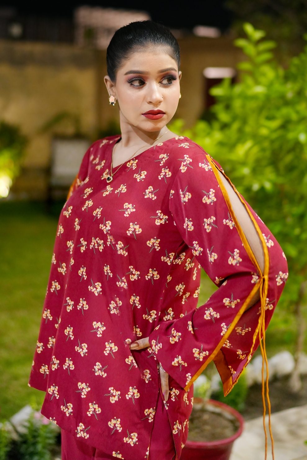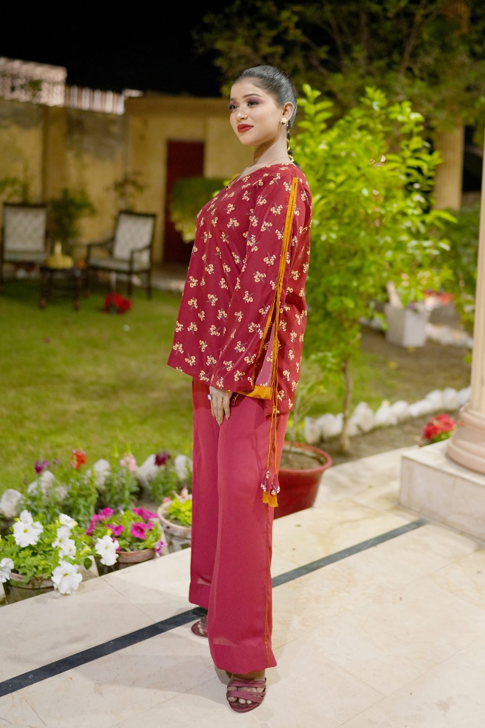 Add a touch of sophistication to your wardrobe with the Saanah Maroon Elegance Tailored Coord Set, a vibrant and stylish ensemble crafted for Pakistani women. This two-piece set features a tailored maroon top with chic floral-patterned sleeves and matching wide-leg pants, made from premium fabric for a refined yet trendy look. The rich maroon hue, accented with delicate orange floral detailing on the sleeves, brings a festive charm, making it ideal for Eid celebrations, family gatherings, or casual chic outings. Designed for a flattering fit, this co-ord set ensures comfort and elegance for any occasion. Embrace the beauty of Pakistani fashion with Saanah Maroon Elegance – a perfect blend of tradition and modern style for women who love to stand out!